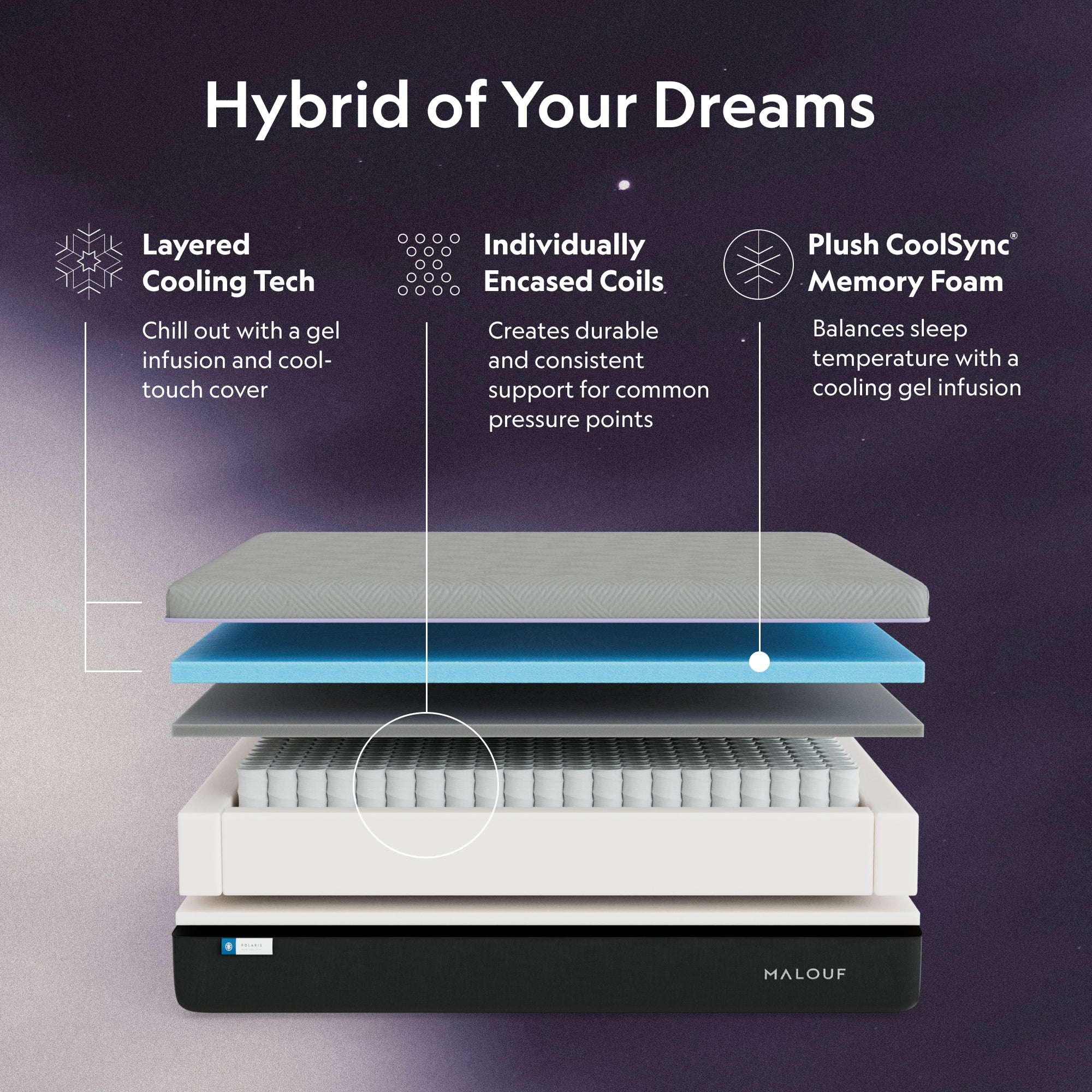 Sleepers who enjoy sleeping cooler on a hybrid mattress that blends traditional springs with memory foam layers will love the Polaris™ Mattress.