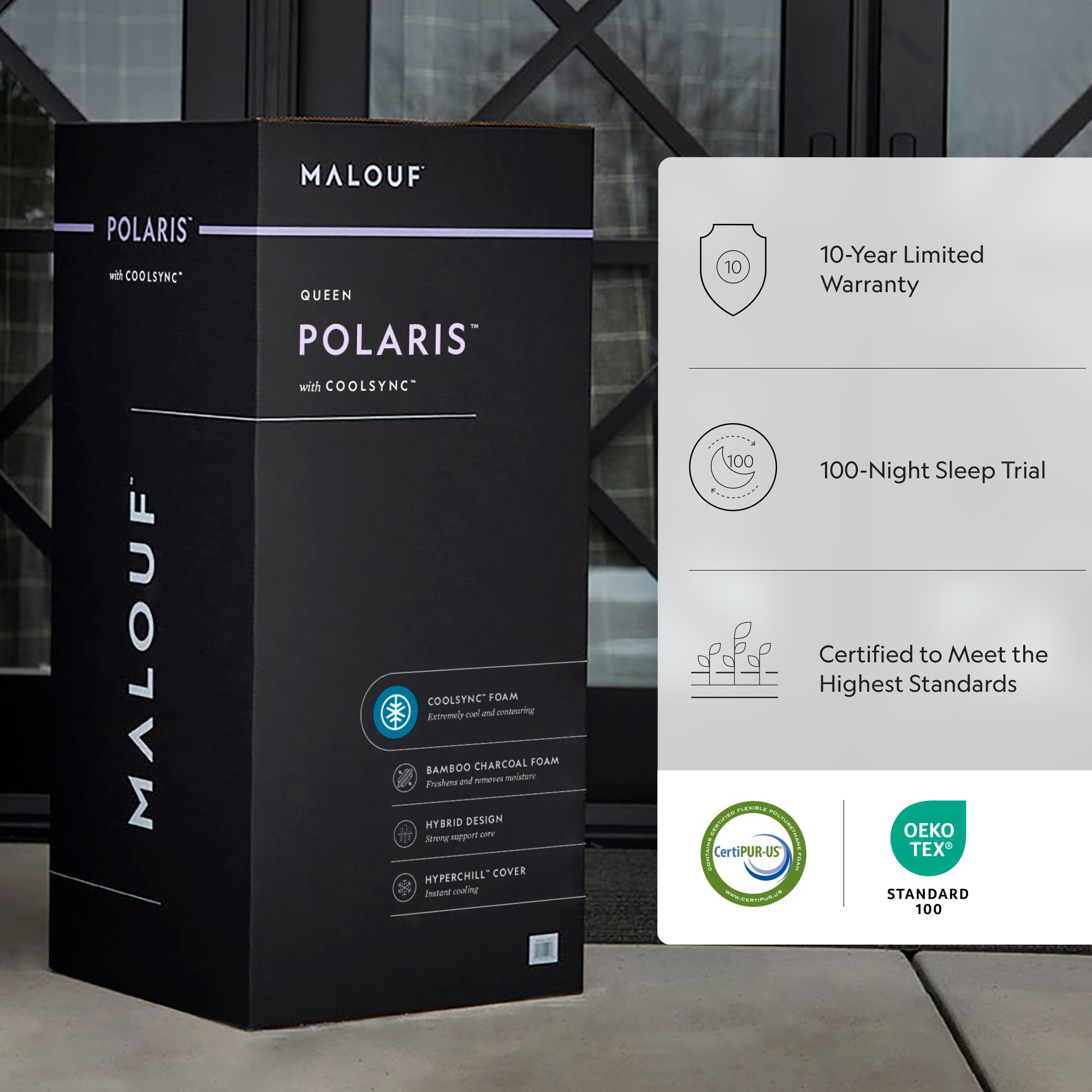The Polaris™ Hybrid Mattress combines coils and memory foam for targeted pressure relief, plus a cooling HyperChill® cover.